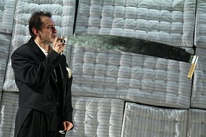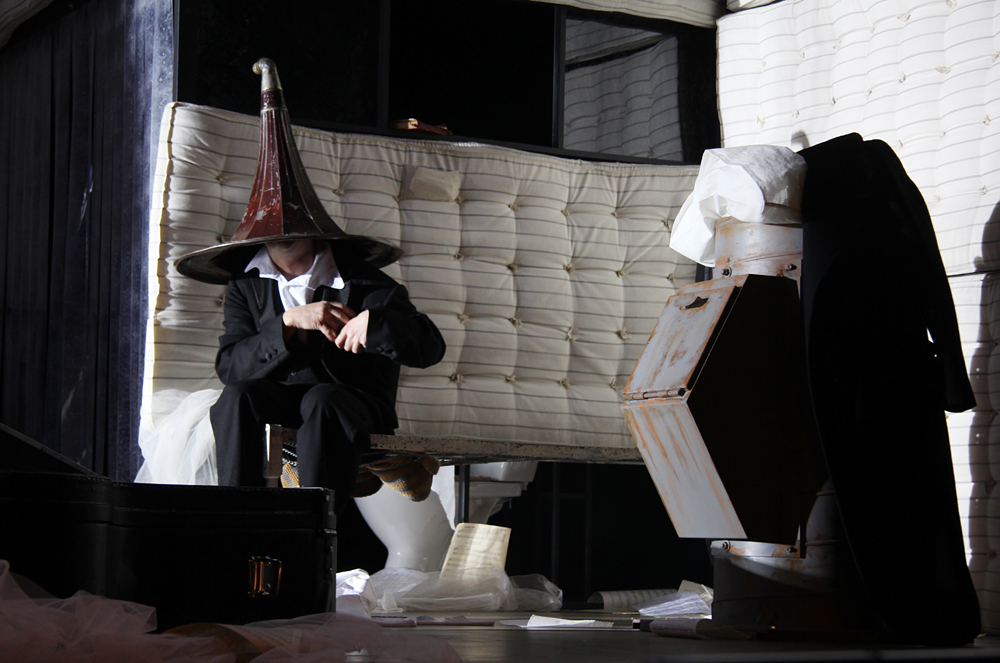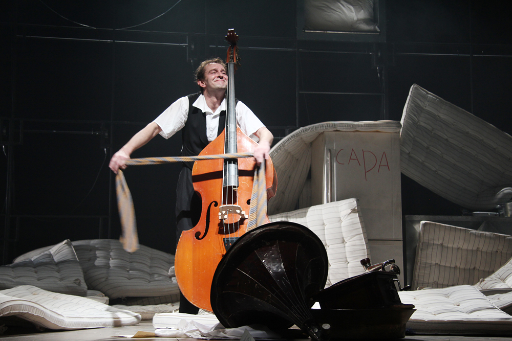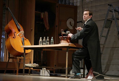 Театральную версию «Контрабаса» Патрика Зюскинда хочется назвать моноспектаклем, но его авторы просят этого не делать: Константин Хабенский будет на сцене не один. Режиссёр и артист поставили своей целью уйти от монологичности, литературности, в которую неизбежно впадает артист на сцене, осваивающий огромный массив текста. В спектакле нет какой-то особой хореографии, но авторы попытались представить «Контрабас» через физическое действие, понятное без слов, словно бы немое кино, гротесковое, трагифарсовое, трагическое. Это не разговор со зрительным залом, во всем сохраняется принцип герметичности истории. В сценографии Николая Симонова действуют эффекты большой сцены МХТ, различные механизмы, но и не только: мир, в котором живёт Контрабасист, — закрыт, душен, непробиваем. Его жилище одновременно является и звукоизолированной музыкальной студией, куда не должен проникать шум извне. Но здесь, внутри, в этом искусственном мире, всё, к чему прикасается Контрабасист, может оживать, издавать звуки, становится предметом игры для одинокого человека. В финале зрителя ожидает сюрприз — действие пойдёт не совсем так, как написал Зюскинд.